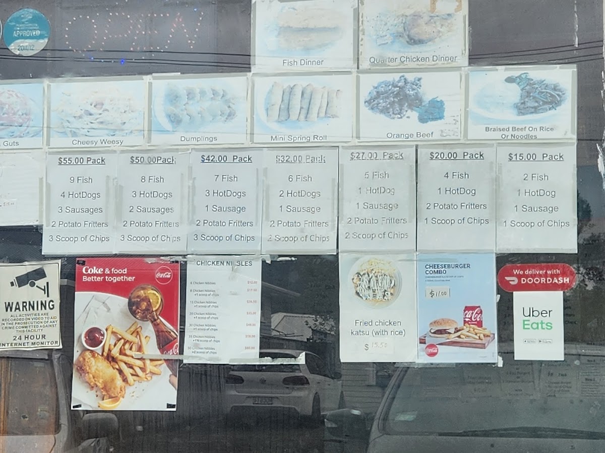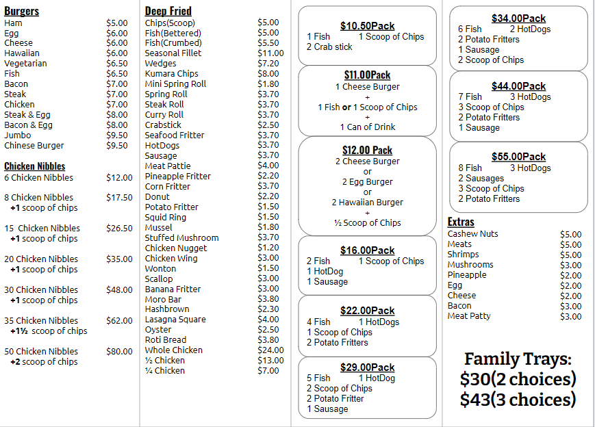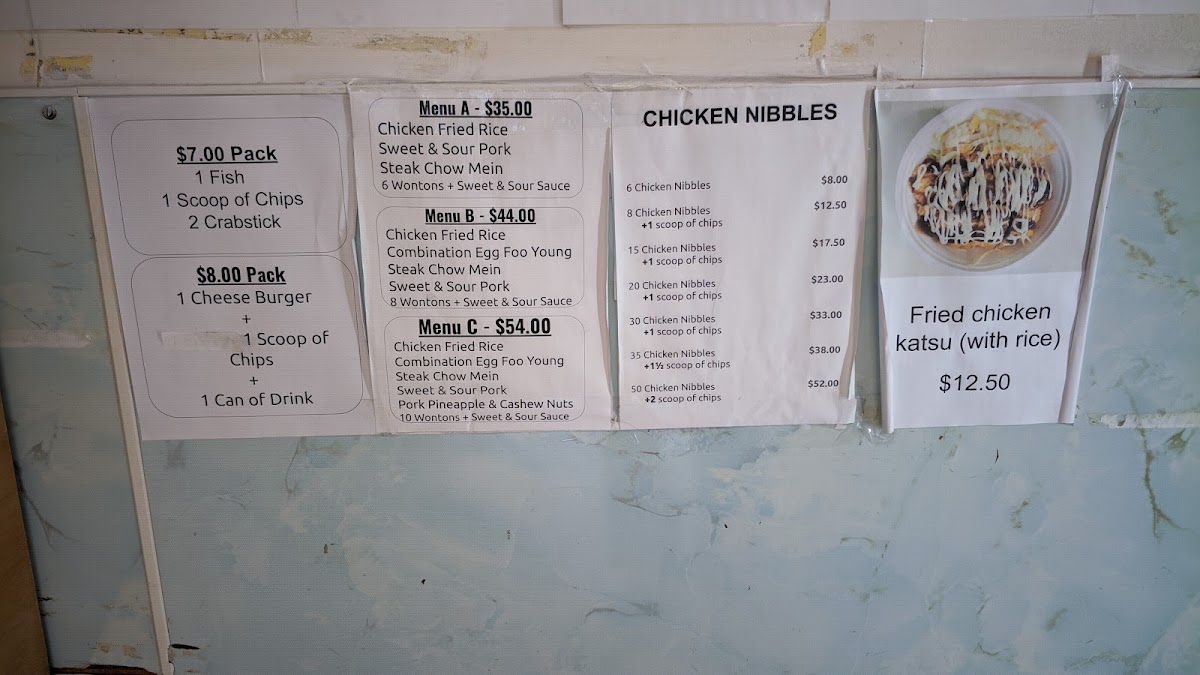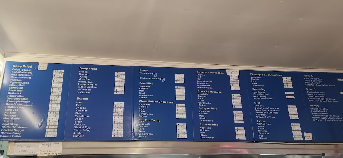 The menu at Blue Oyster Seafoods in Wainuiomata offers a wide variety of flavorful and satisfying options. For those craving something quick and indulgent, the Cheey Weesy Chips (1 scoop of chips with cheese and mayonnaise sauce) and Blood and Guts Chips (chips with cheese, mayonnaise, and tomato sauce) are perfect choices. Their curry dishes, including Chicken Curry on Rice and Pork Curry on Rice, cater to a variety of tastes, while Deep Fried Wonton (12 pieces with sweet and sour sauce) offers a crunchy appetizer. For rice lovers, the Vegetable Fried Rice and Combination Fried Rice are crowd-pleasers, alongside specialties like the spicy Nasi Goreng and Bami Goreng. The Sweet & Sour Pork on Rice and Orange Chicken on Rice deliver a balance of tangy and savory flavors. The Egg Foo Young varieties, such as Pork Egg Foo Young and Shrimp Egg Foo Young, provide hearty options with an Asian twist. There’s also a great selection of soups like Pork Wonton Soup and Chicken and Corn Soup for those seeking warmth. For a more filling meal, the Chicken Katsu with Rice or the Burger Combo options, including the Cheese Burger Combo, are sure to satisfy. If you’re after a family meal, the Family Pack selections, which include combinations of fish, hot dogs, and chips, are a great value. The Set Menu options, such as Set A and Set C, offer a little bit of everything, from fried rice to sweet and sour pork. To complete your meal, choose from a range of refreshing Soda Drinks like Coke or Fanta. With something for everyone, the Blue Oyster Seafoods menu is a perfect destination for a hearty and diverse meal.